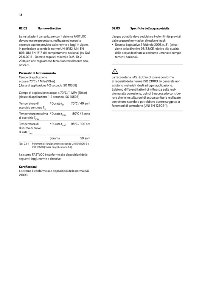 Tab. 02-1 Parametri di funzionamento secondo UNI EN 806-2 e