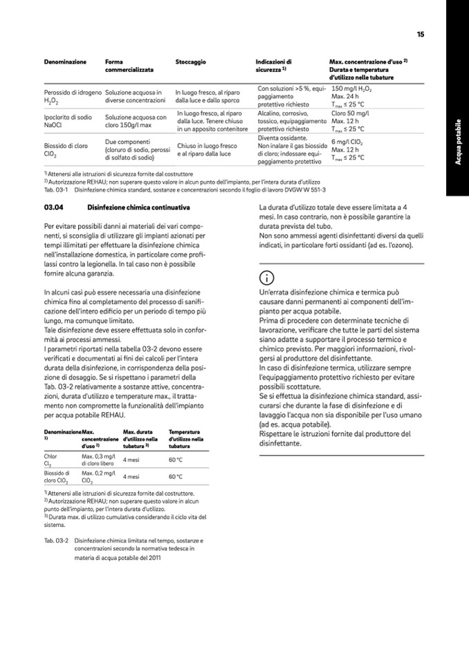 Tab. 03-1 Disinfezione chimica standard, sostanze e concentrazioni secondo il foglio di lavoro DVGW W 551-3