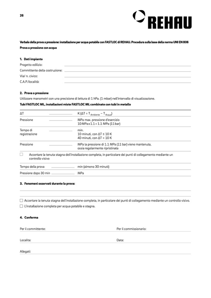 Verbale della prova a pressione: installazione per acqua potabile con FASTLOC di REHAU. Procedura sulla base della norma UNI EN 806