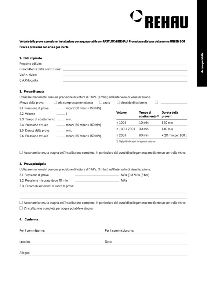 Verbale della prova a pressione: installazione per acqua potabile con FASTLOC di REHAU. Procedura sulla base della norma UNI EN 806