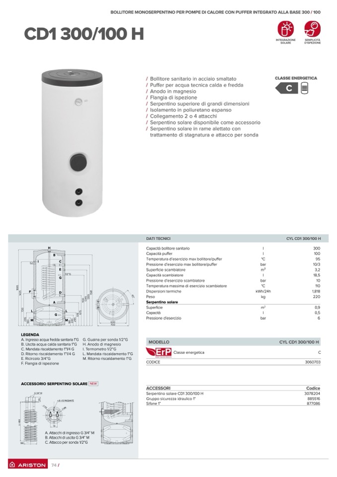 BOLLITORE MONOSERPENTINO PER POMPE DI CALORE CON PUFFER INTEGRATO ALLA BASE 300 / 100