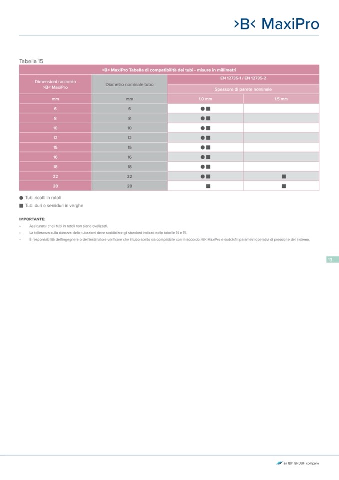 È responsabilità dell'ingegnere o dell'installatore verificare che il tubo scelto sia compatibile con il raccordo >B< MaxiPro e soddisfi i parametri operativi di pressione del sistema.