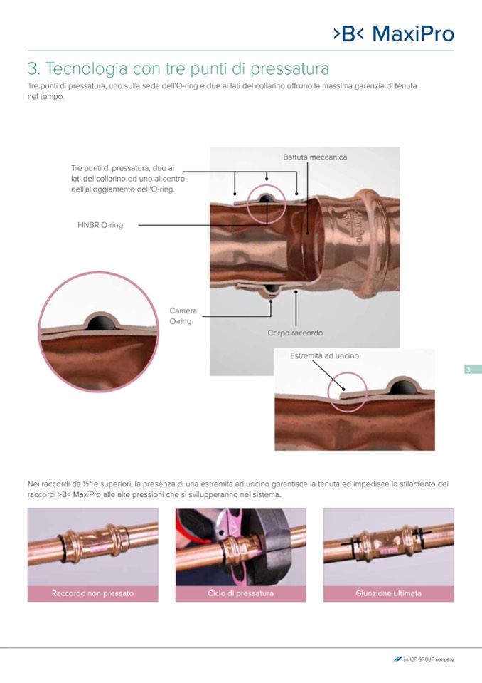 Tre punti di pressatura, uno sulla sede dell'O-ring e due ai lati del collarino offrono la massima garanzia di tenuta