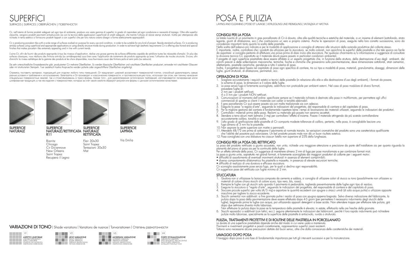 Cir is producing porcelain tiles with a wide range of surfaces studied on purpose for every use and condition, in order to be suitable for any kind of project. Beside standard surfaces, Cir is producing