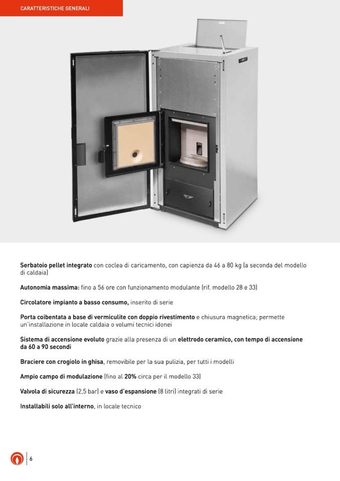 Serbatoio pellet integrato con coclea di caricamento, con capienza da 46 a 80 kg (a seconda del modello