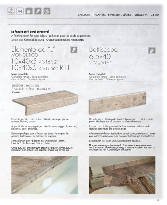 A specific tile for trimming edges. Ideal for swimming pools, terraces,