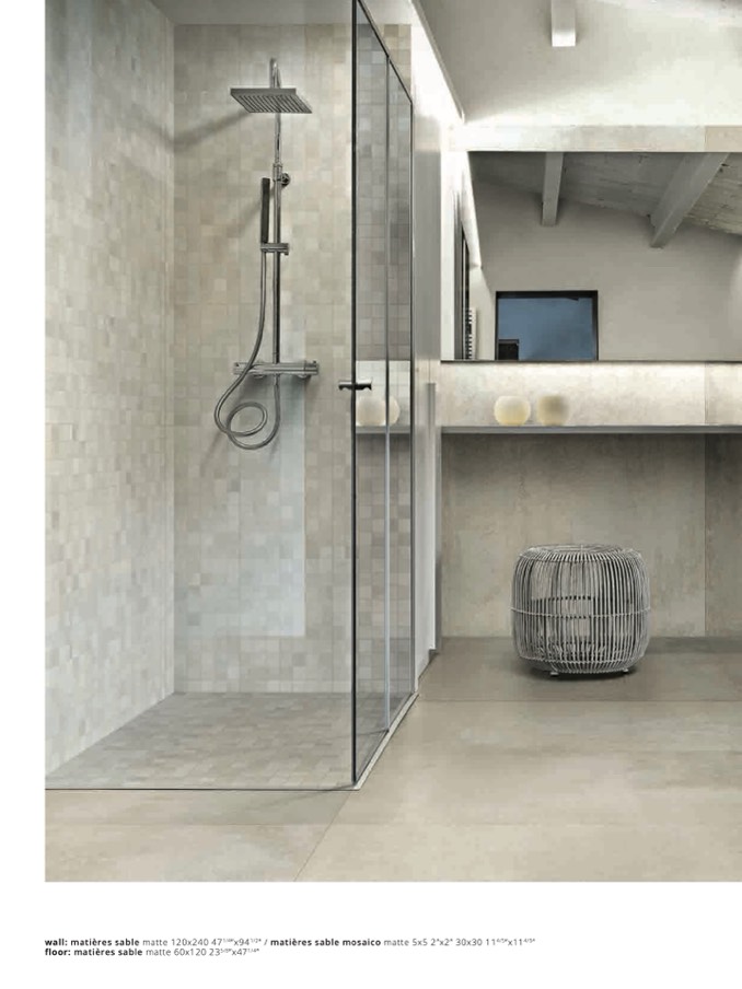 wall: matières sable matte 120x240 471/4”x941/2” / matières sable mosaico matte 5x5 2”x2” 30x30 114/5”x114/5”