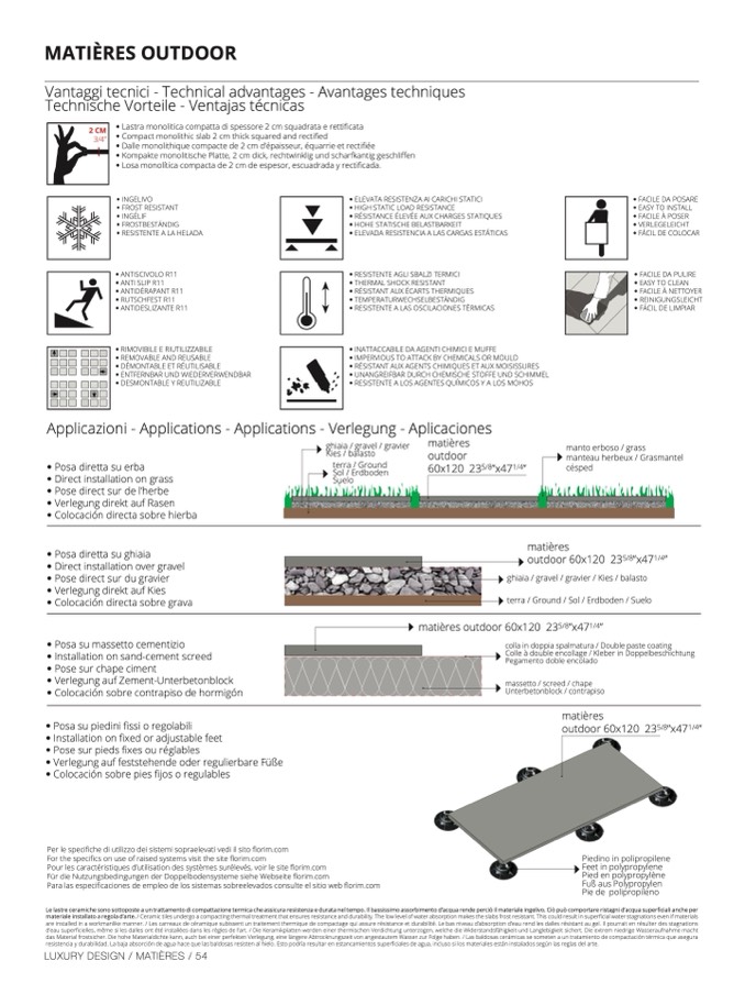 d’eau superficielles, même si les dalles ont été installées dans les règles de l’art. / Die Keramikplatten werden einer thermischen Verdichtung unterzogen, welche die Widerstandsfähigkeit und Langlebigkeit sichert. Die extrem niedrige Wasseraufnahme macht