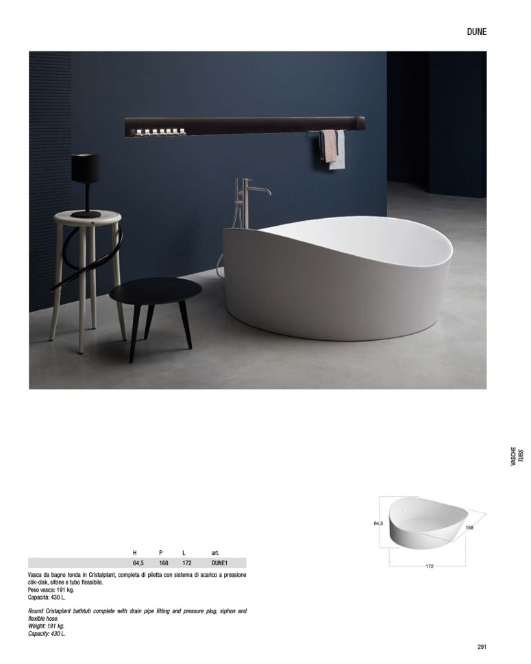 Vasca da bagno tonda in Cristalplant, completa di piletta con sistema di scarico a pressione