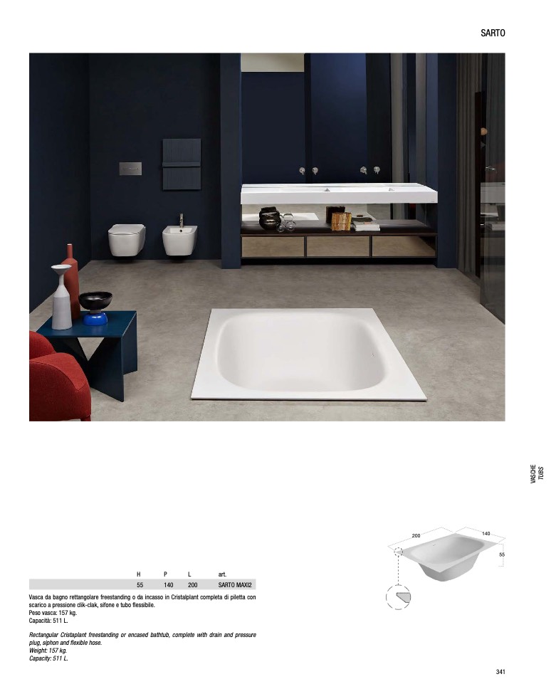 Rectangular Cristaplant freestanding or encased bathtub, complete with drain and pressure