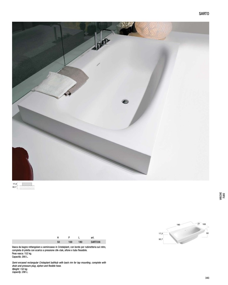 Semi-encased rectangular Cristaplant bathtub with back rim for tap mounting, complete with