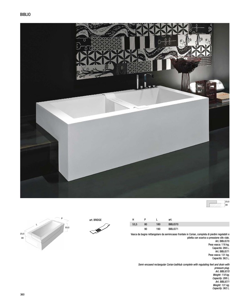 Vasca da bagno rettangolare da semincasso frontale in Corian, completa di piedini regolabili e