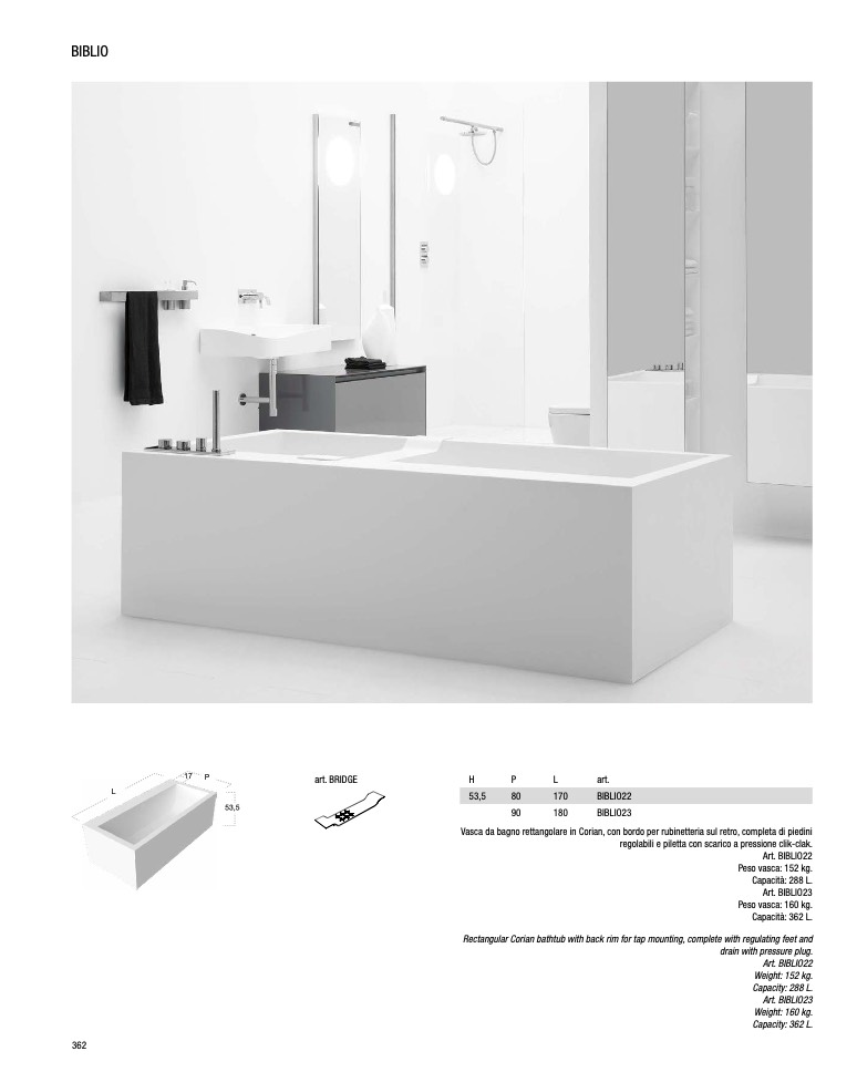 Rectangular Corian bathtub with back rim for tap mounting, complete with regulating feet and