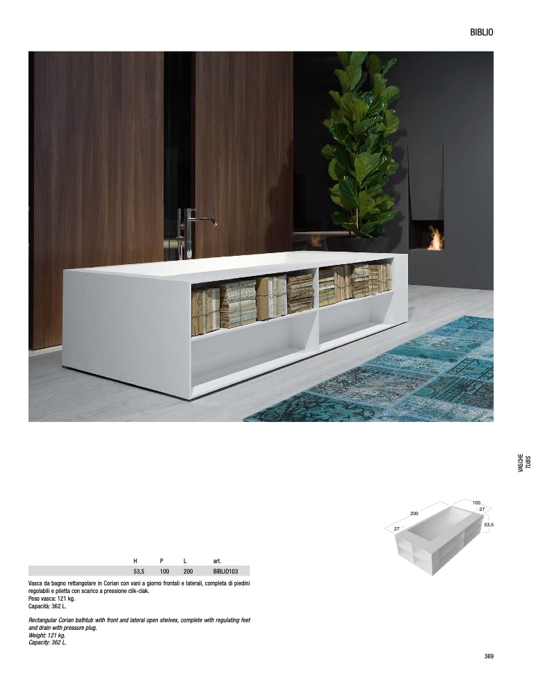 Rectangular Corian bathtub with front and lateral open shelves, complete with regulating feet