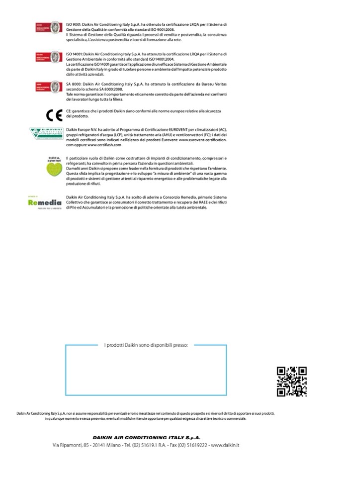 Daikin Air Conditioning Italy S.p.A. non si assume responsabilità per eventuali errori o inesattezze nel contenuto di questo prospetto e si riserva il diritto di apportare ai suoi prodotti,