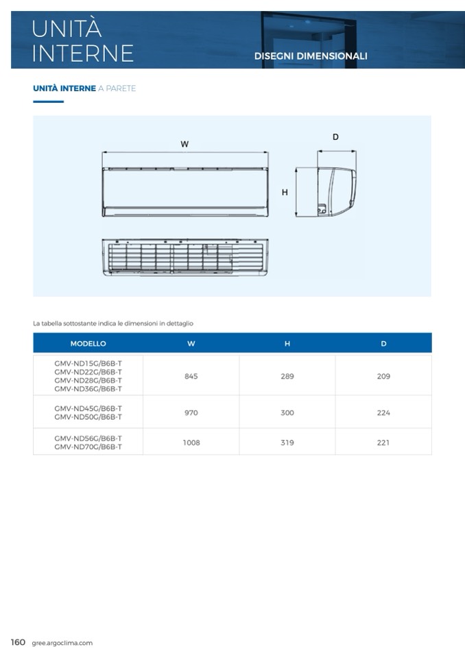 Di seguito sono riportate le dimensioni di larghezza (W), altezza (H) e profondità (D) per i diversi