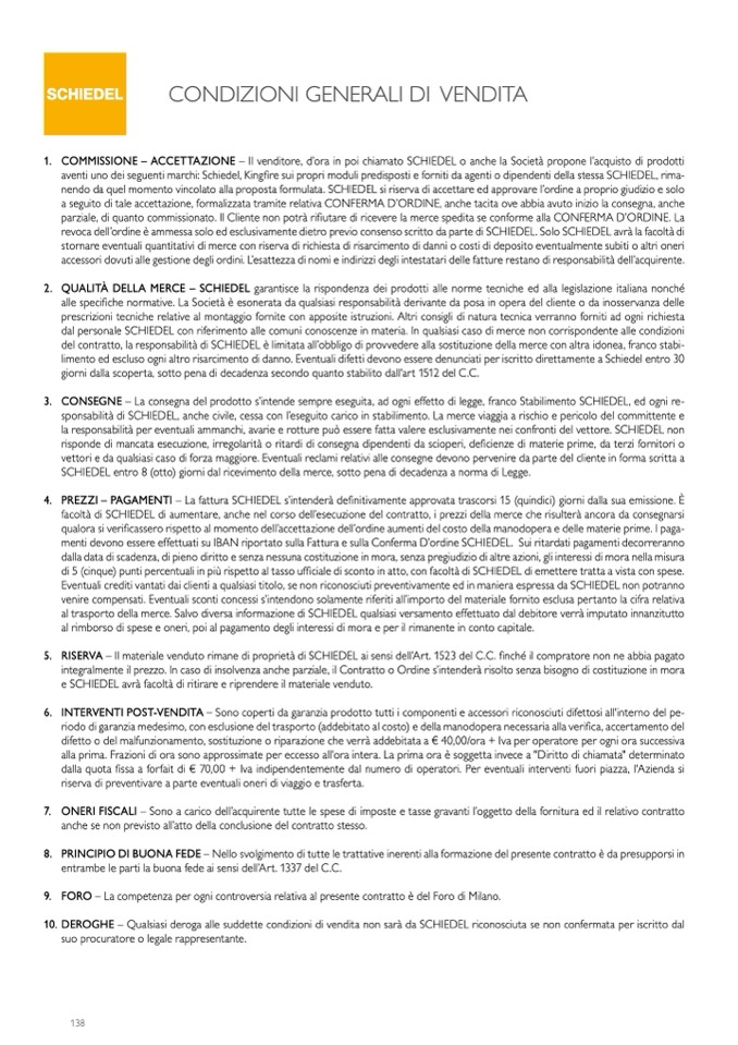 10. DEROGHE – Qualsiasi deroga alle suddette condizioni di vendita non sarà da SCHIEDEL riconosciuta se non confermata per iscritto dal