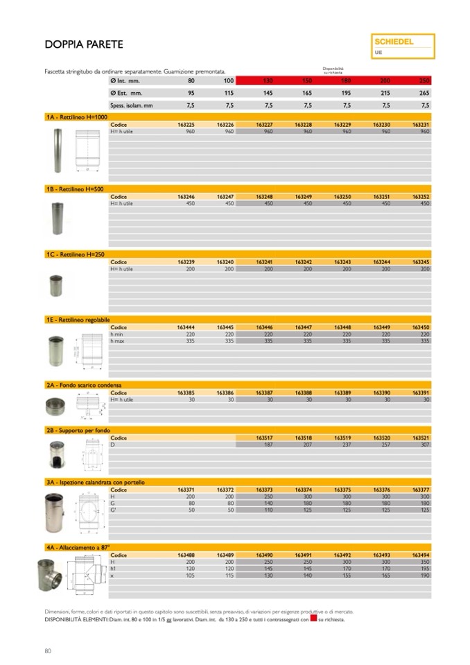 DISPONIBILITÀ ELEMENTI: Diam. int. 80 e 100 in 1/5 gg lavorativi. Diam. int. da 130 a 250 e tutti i contrassegnati con