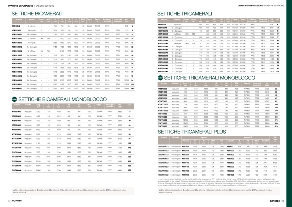 A.E.= abitanti equivalenti: Ø= diametro; H= altezza; HE= altezza tubo entrata; HU= altezza tubo uscita; ØE/U= diametro tubo
