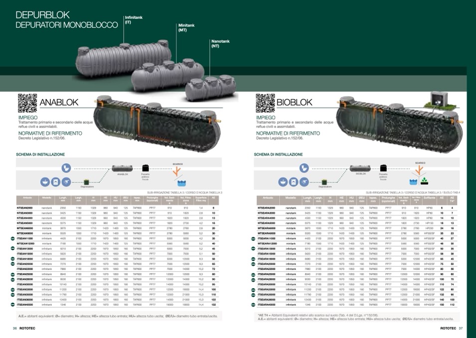 A.E.= abitanti equivalenti: Ø= diametro; H= altezza; HE= altezza tubo entrata; HU= altezza tubo uscita; ØE/U= diametro tubo entrata/uscita.