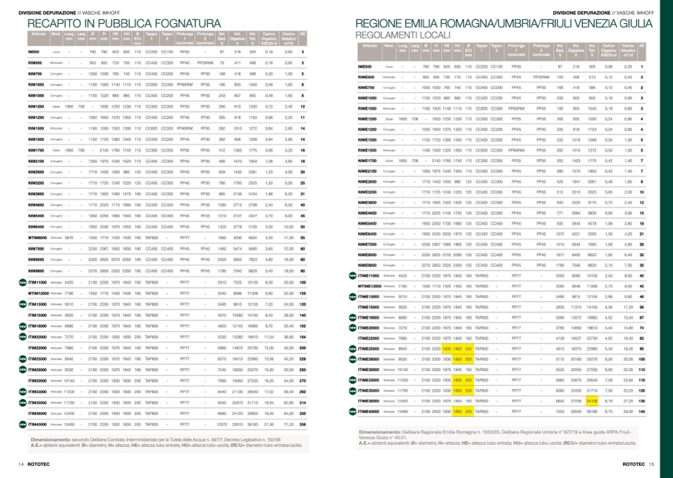 A.E.= abitanti equivalenti: Ø= diametro; H= altezza; HE= altezza tubo entrata; HU= altezza tubo uscita; ØE/U= diametro tubo entrata/uscita.
