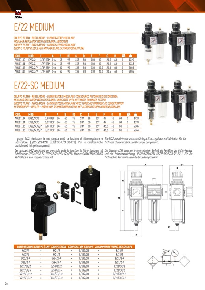 The E/22 are all-in-one units combining a filter, regulator and lubricator. For the
