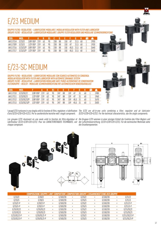 IgruppiE/23riunisconoinunasingolaunitàlafunzionedifiltro,regolatoreelubrificatore