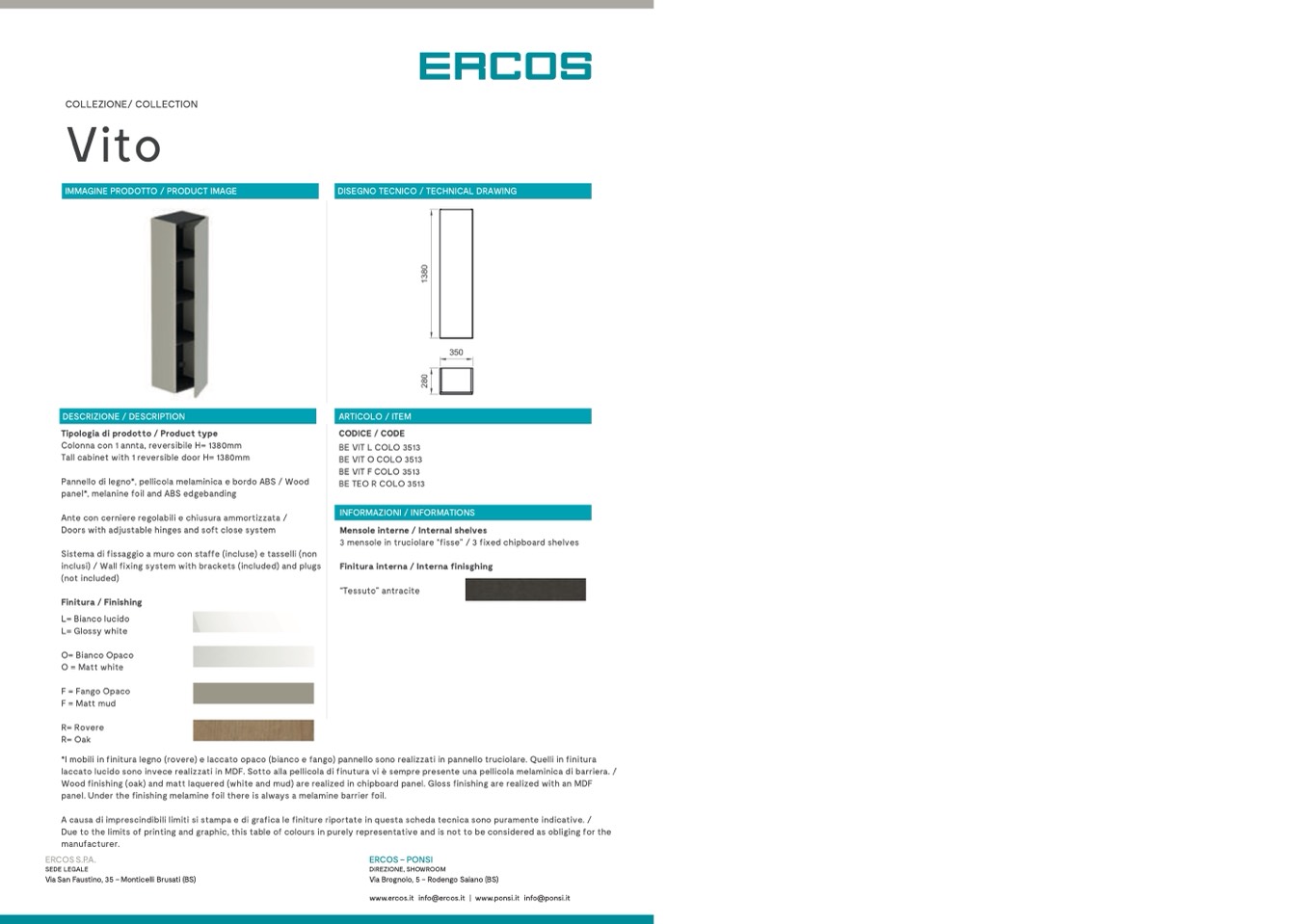 A causa di imprescindibili limiti si stampa e di grafica le finiture riportate in questa scheda tecnica sono puramente indicative. /