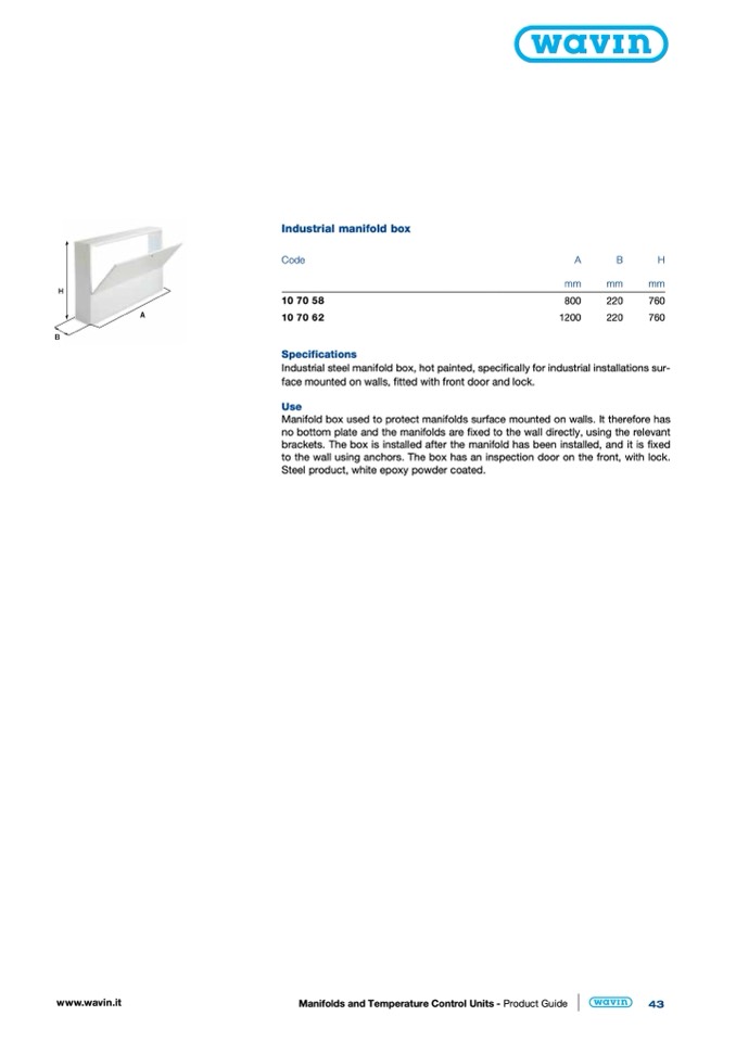 Manifold box used to protect manifolds surface mounted on walls. It therefore has