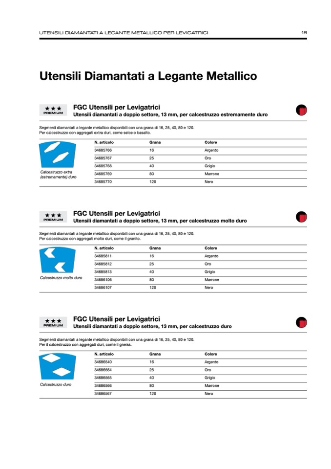 Segmenti diamantati a legante metallico disponibili con una grana di 16, 25, 40, 80 e 120.