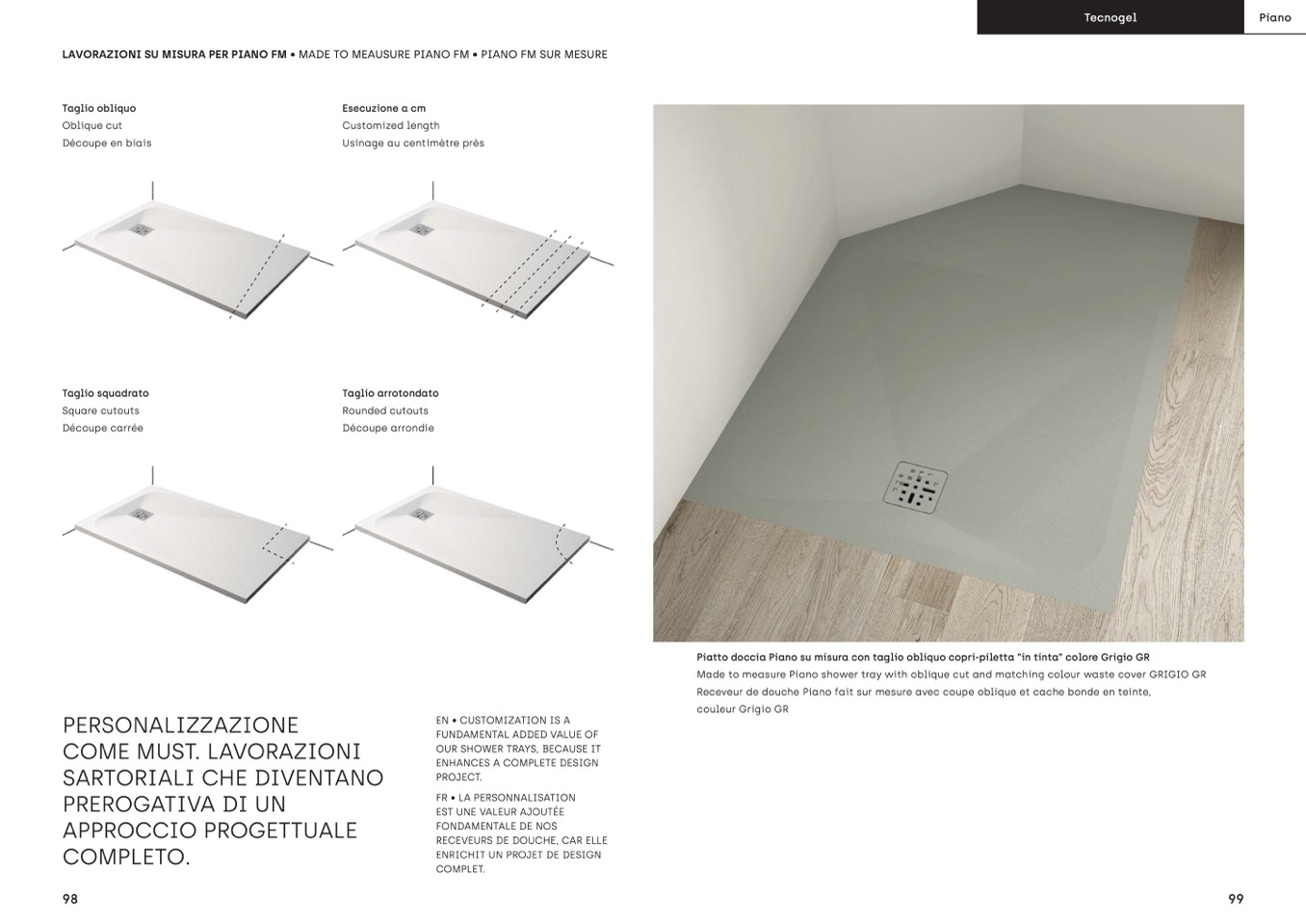 Piatto doccia Piano su misura con taglio obliquo copri-piletta “in tinta” colore Grigio GR