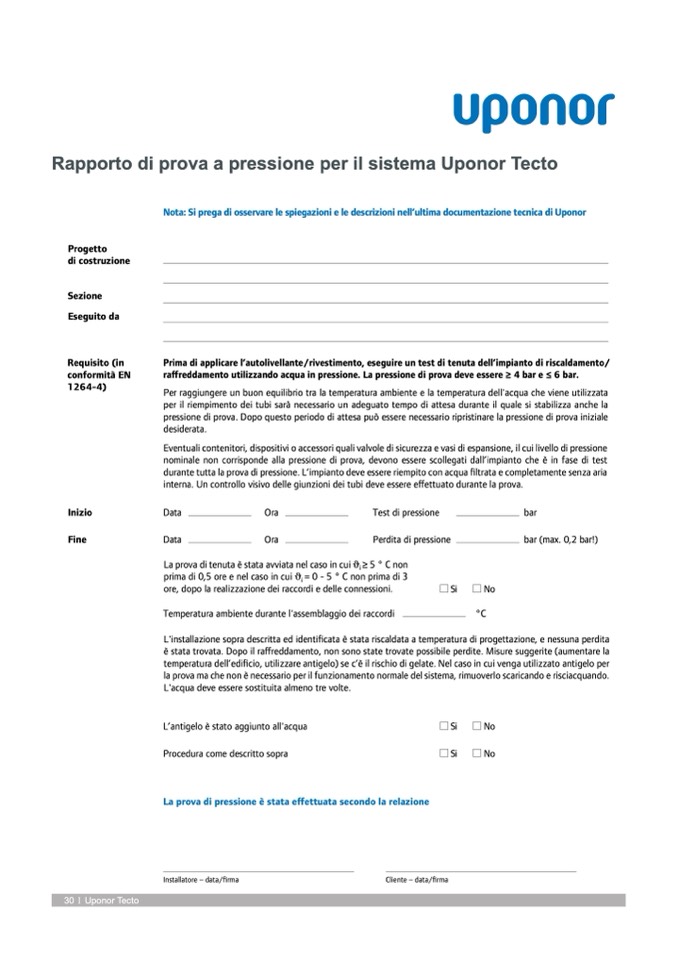 pressione di prova. Dopo questo periodo di attesa può essere necessario ripristinare la pressione di prova iniziale
