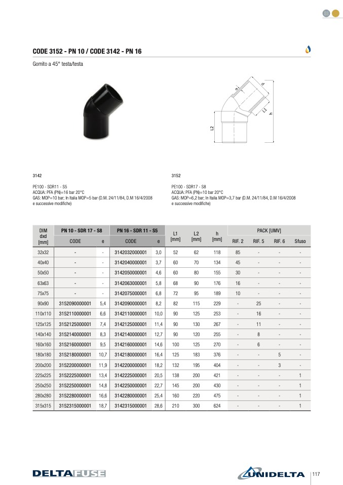 Gomito a 45° testa/testa