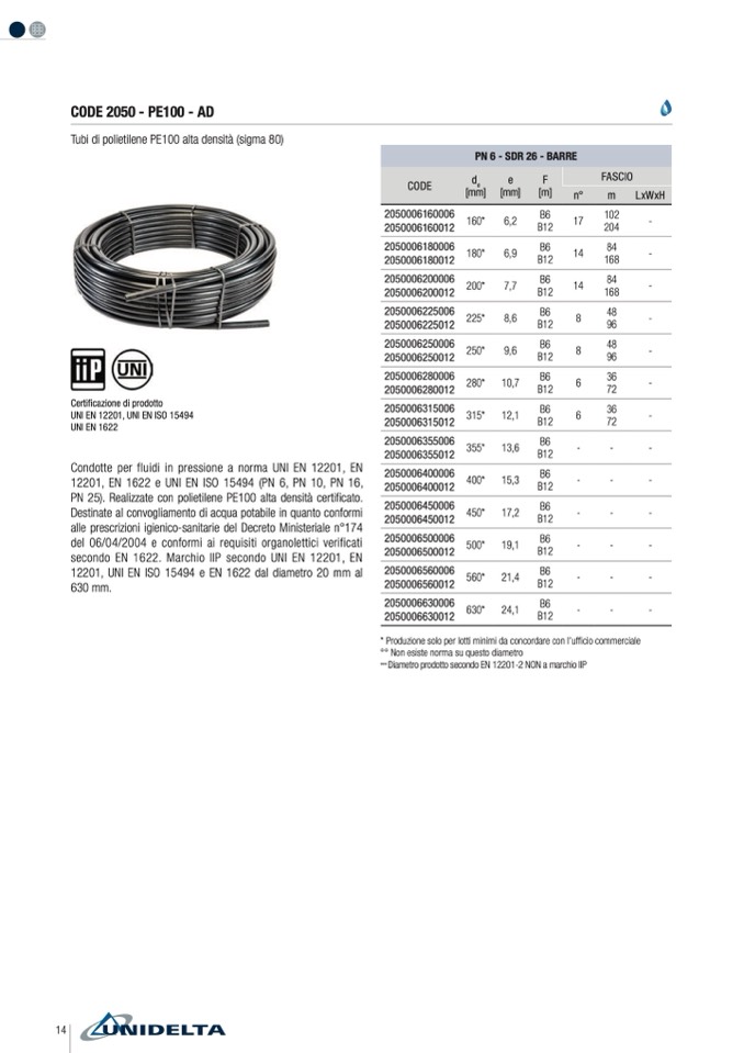 secondo EN 1622. Marchio IIP secondo UNI EN 12201, EN