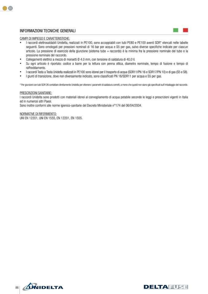 * Per giunzioni con tubi SDR 26 contattare direttamente Unidelta per ottenere i parametri di saldatura corretti, a meno che questi non siano già specificati sull’imballaggio del raccordo.