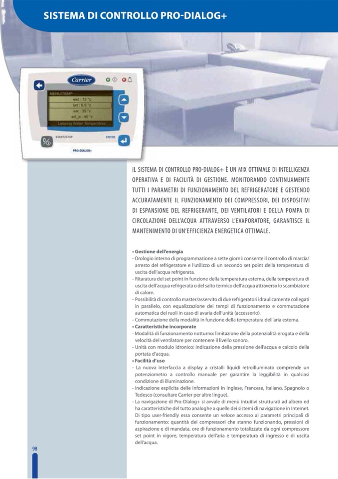 - Possibilità di controllo master/asservito di due refrigeratori idraulicamente collegati