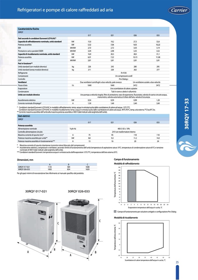** Assorbimentoelettrico,compressorieventilatori,secondoilimitidifunzionamentodell’unità(temperaturadiaspirazionesatura10°C,temperaturadicondensazionesatura65°C)etensione