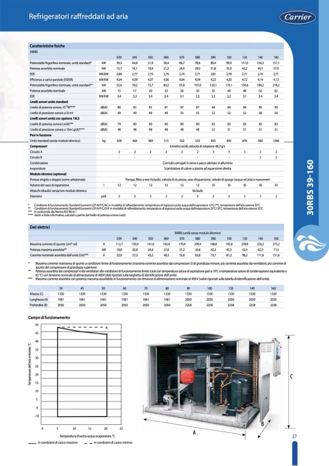 Condizioni di funzionamento Standard Eurovent LCP/A/P/C/AC in modalità di raffreddamento: temperatura di ingresso/uscita acqua dall’evaporatore 12°C/7°C, temperatura dell’aria esterna 35°C