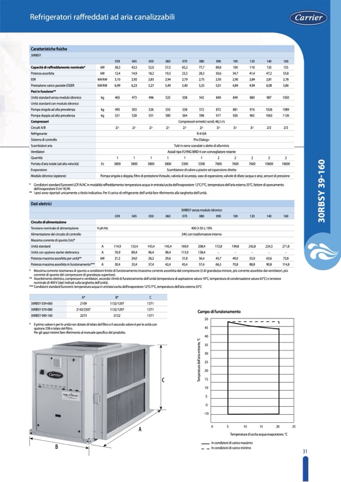 ** Assorbimentoelettrico,compressorieventilatori,secondoilimitidifunzionamentodell’unità(temperaturadiaspirazionesatura10°C,temperaturadicondensazionesatura65°C)etensione