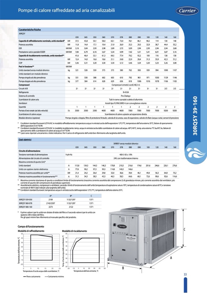 ** Assorbimentoelettrico,compressorieventilatori,secondoilimitidifunzionamentodell’unità(temperaturadiaspirazionesatura10°C,temperaturadicondensazionesatura65°C)etensione