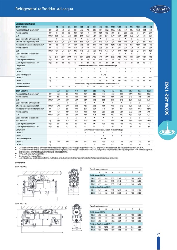 Condizioni Eurovent standard, raffreddamento: temperatura di ingresso/uscita dell’acqua evaporatore = 12°C/7°C. Temperatura di ingresso/uscita dell’acqua condensatore = 30°C/35°C.
