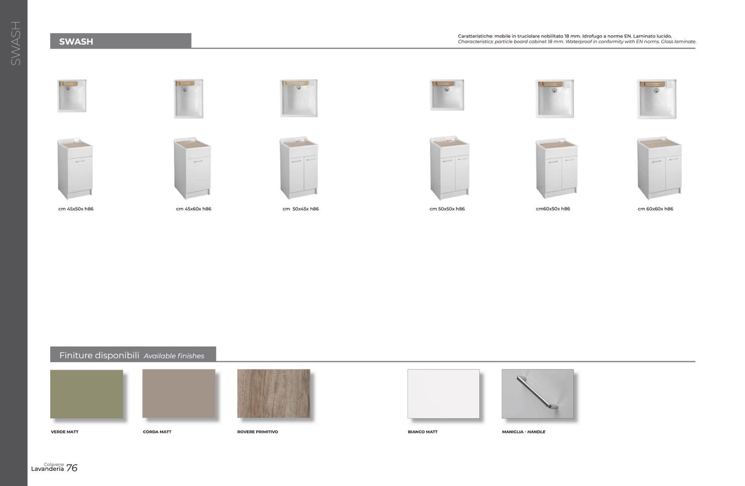 Characteristics: particle board cabinet 18 mm. Waterproof in conformity with EN norms. Gloss laminate.