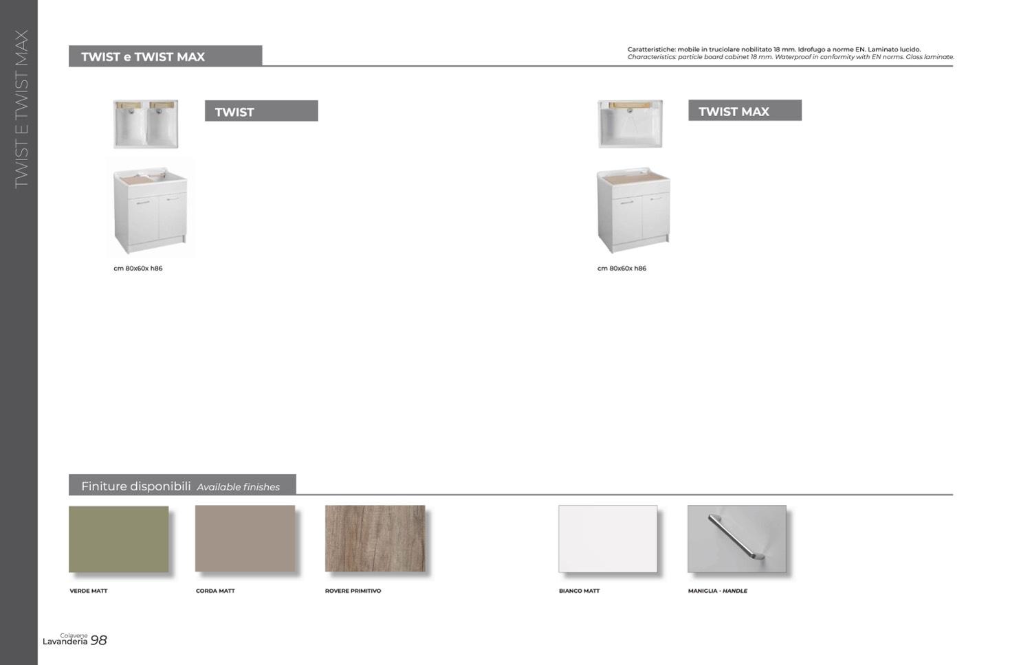 Characteristics: particle board cabinet 18 mm. Waterproof in conformity with EN norms. Gloss laminate.
