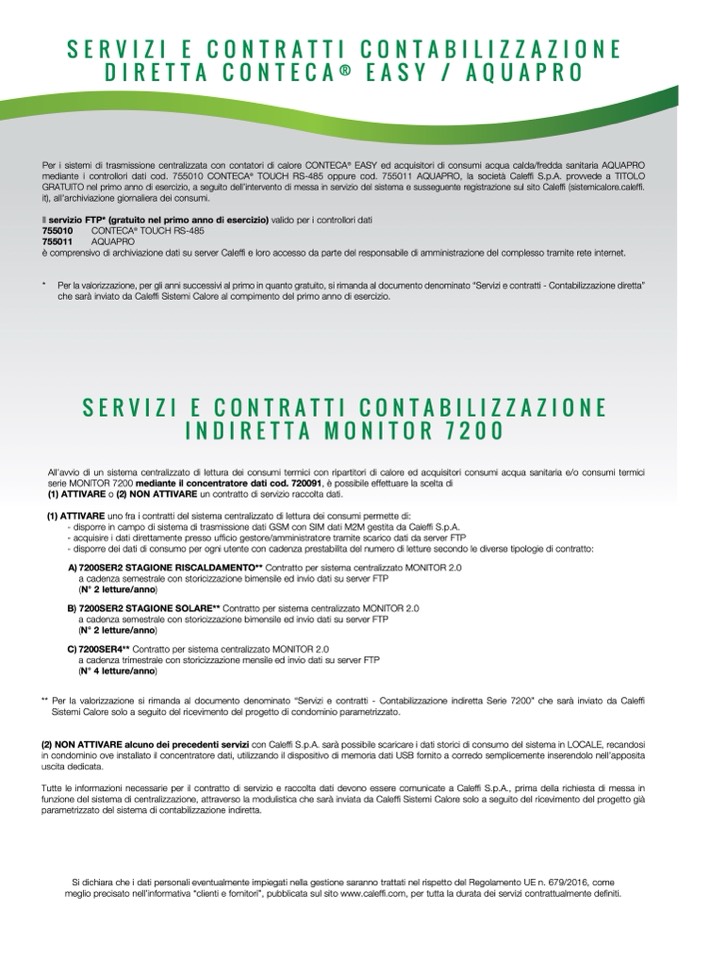 Tutte le informazioni necessarie per il contratto di servizio e raccolta dati devono essere comunicate a Caleffi S.p.A., prima della richiesta di messa in