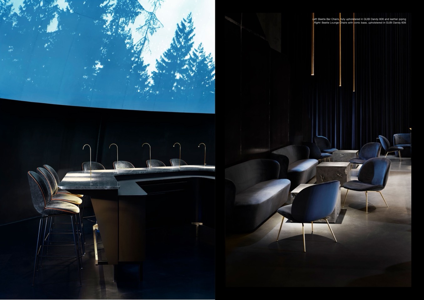 Left: Beetle Bar Chairs, fully upholstered in GUBI Dandy 606 and leather piping