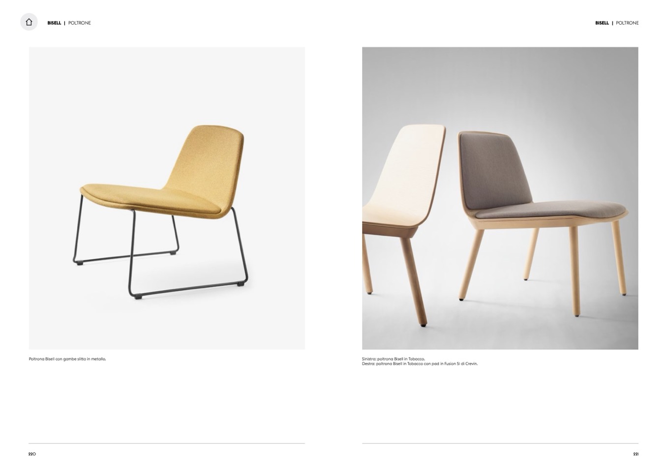 Destra: poltrona Bisell in Tobacco con pad in Fusion 51 di Crevin.