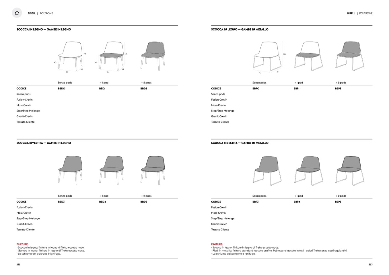 - Gambe in legno: finiture in legno di Treku eccetto noce.