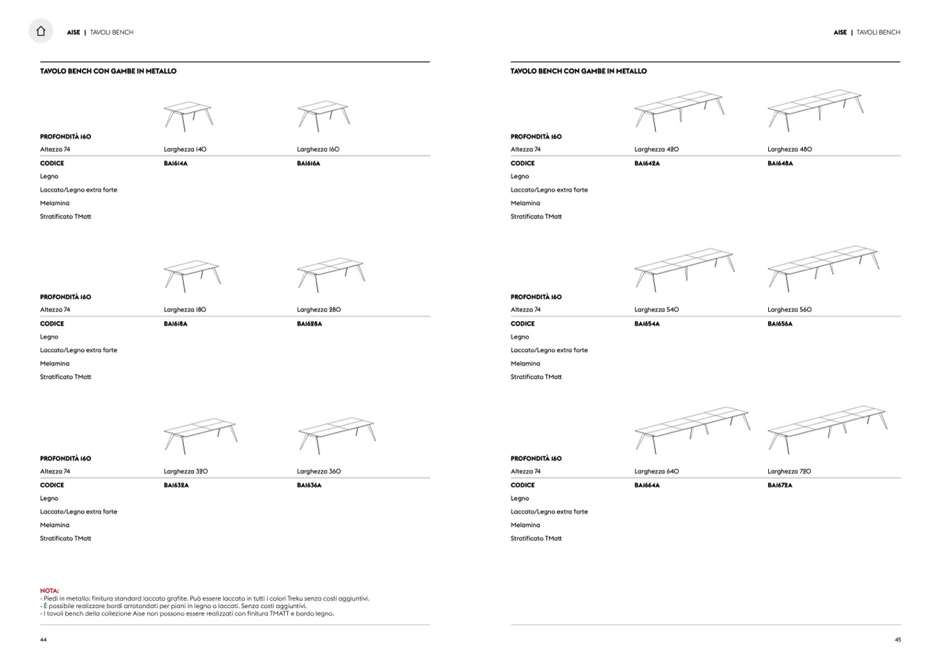 - I tavoli bench della collezione Aise non possono essere realizzati con finitura TMATT e bordo legno.