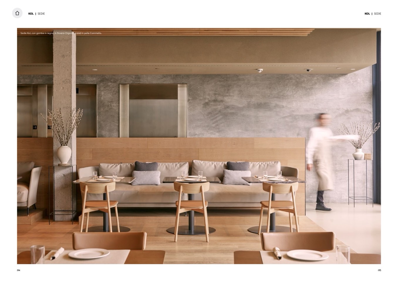 Sedie Kol, con gambe in legno, in Rovere Organic e pad in pelle Cammello.