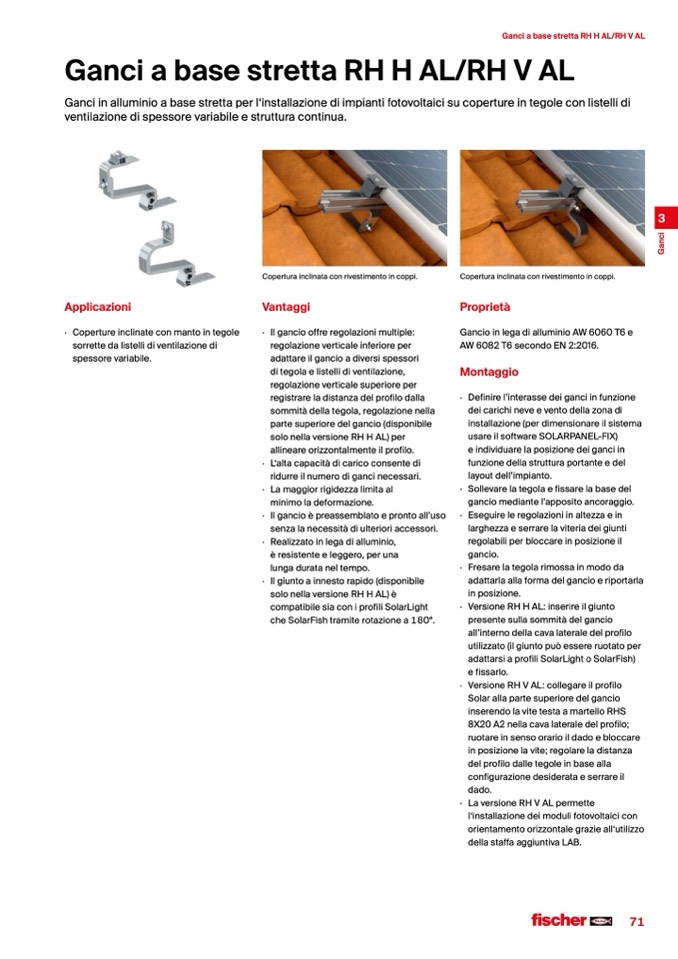 Ganci in alluminio a base stretta per l‘installazione di impianti fotovoltaici su coperture in tegole con listelli di